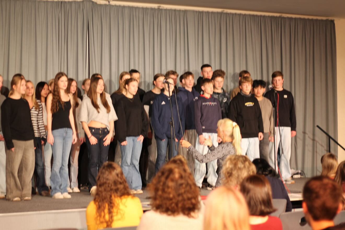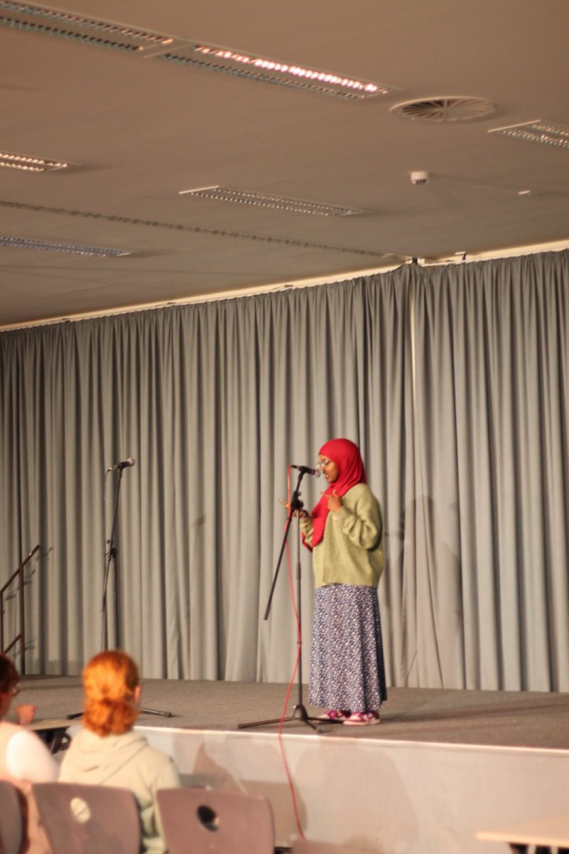 „Mut braucht Bühne“, unter diesem Motto hatten Schreibtalente, initiiert von der AG „Schule ohne Rassismus“ und dem Abiturjahrgang unseres Gymnasiums, in der Aula des Stadtfeld-Gebäudes die Gelegenheit, ihre selbstgeschriebenen Texte zu präsentieren. Für musikalische Untermalung sorgten der Rapper Kizuki aus Braunschweig, ein Projektchor aus mehreren 9. Klassen mit dem Song „Wind of change“ unter der Leitung von Frau Ristau, Lara mit einem Stück am Klavier und Amira aus dem 12. Jahrgang mit ihrer Interpretation des Songs „Imagine“.